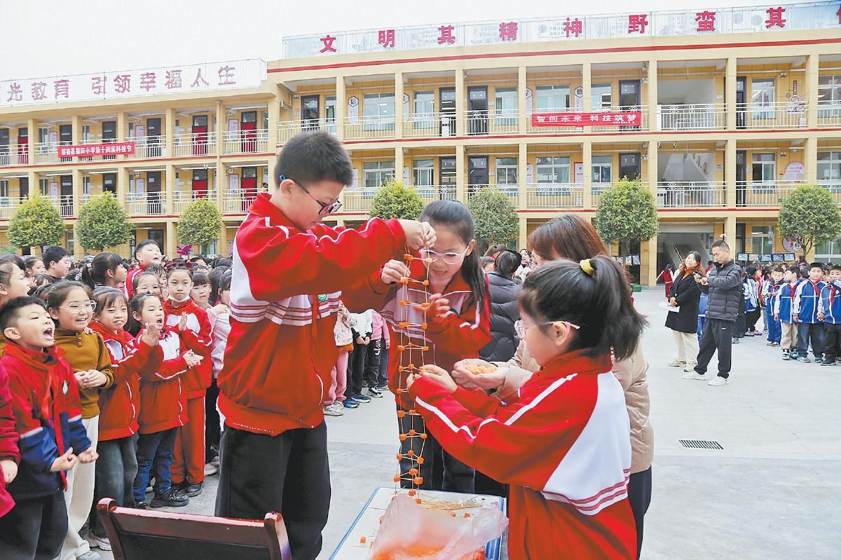 现场展出的科幻画与手抄报尽显奇思妙想,“变废为宝”作品践行了绿色理念。动手实践环节,一系列趣味盎然的科技活动让学生沉浸其中:“萝卜块搭塔”项目考验了学生对结构力学与稳定性的理解;“夹玻璃球”锻炼了学生的手眼协调与精细操作能力;魔方与智力七巧板比赛则是对学生空间思维能力的挑战。