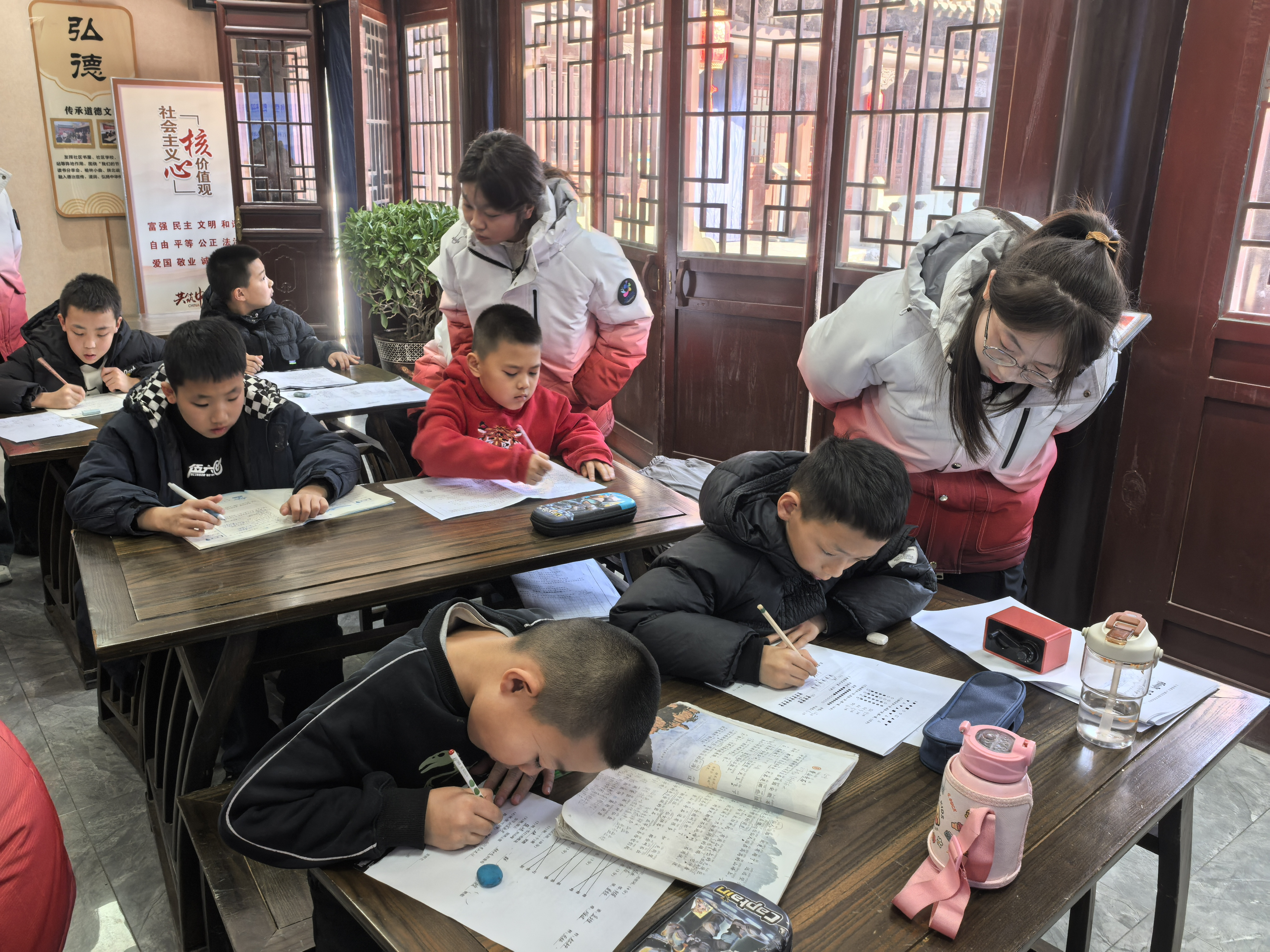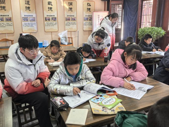 在作业辅导环节,志愿者们以“一对一”形式陪伴孩子们完成寒假作业。同时,结合课堂所学的冬运会知识,引导孩子们将体育精神融入日常学习中。