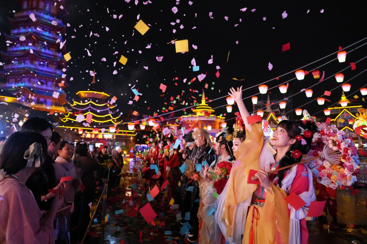 日间演艺活力满满,夜间盛宴震撼升级。周年庆期间,方特梦幻王国以美国街“梦幻迎宾秀”拉开欢乐序幕,甜心女团与熊出没家族联袂登场,并在“春日花漾巡游”中为游客带来一场视觉盛宴;更有“元气随舞派对”邀请游客共舞青春,沉浸式感受周年庆欢乐氛围。方特在东方神画则集结国风男团与国风花神,高颜值NPC阵容成为园区亮眼风景;还有古市、潮市、野人部落等五大戏精街区融合沉浸式互动演艺,让游客收获“一步一景、步步有戏”的惊喜。夜幕降临,光影大秀璀璨登场——“奇遇春日宴舞台秀”与“宝塔飞花光影秀”震撼上演,非遗打铁花与现代建筑投影技术在雷峰塔下交相辉映,呈现出穿越时空的光影盛宴。