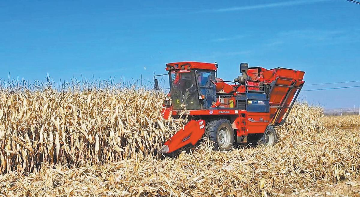 收割机在种植大户的玉米地采收玉米。康孝桃 摄