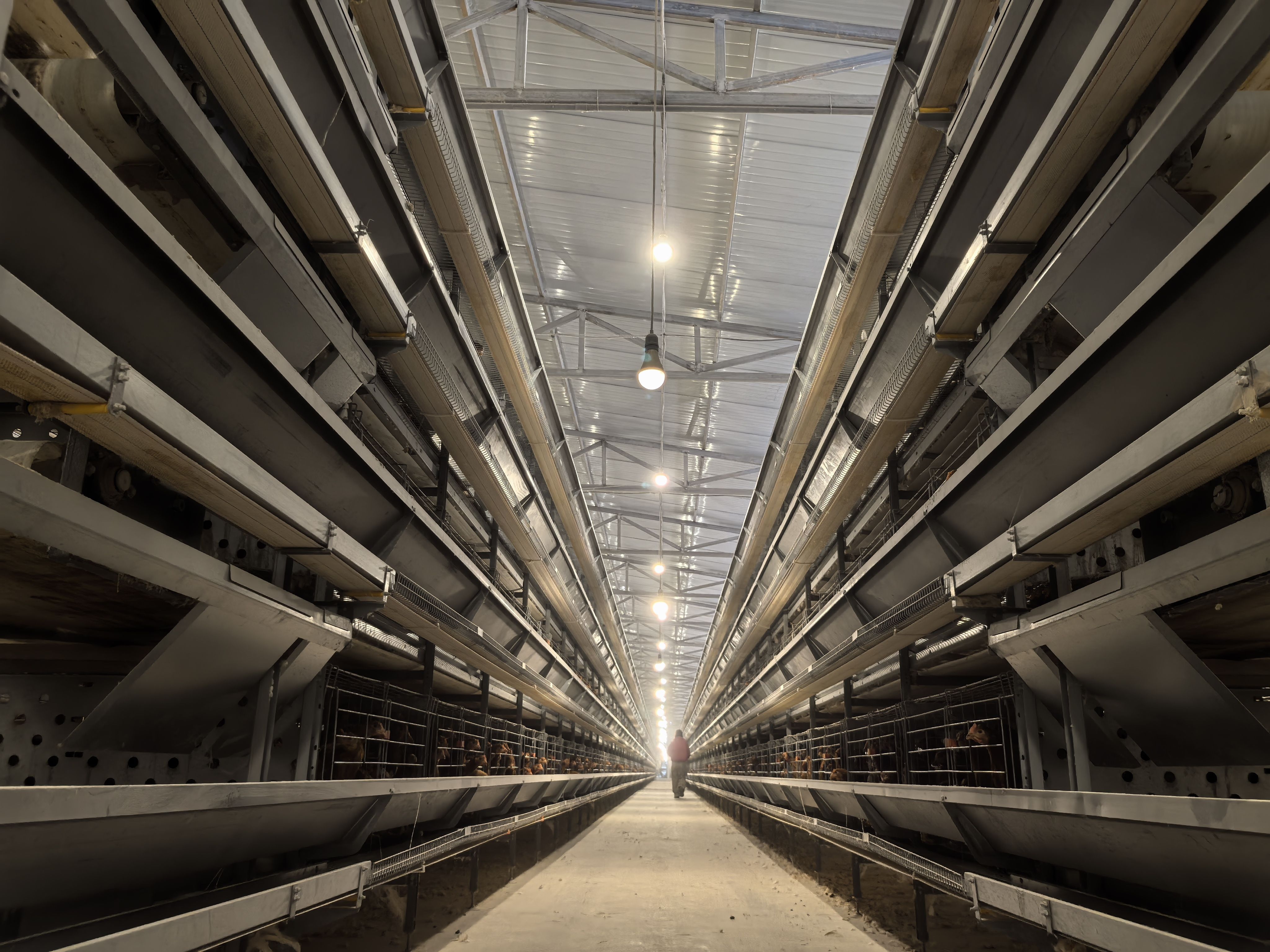 3栋标准化鸡舍整齐排列,智能系统精准调控着鸡舍的温度、湿度与通风;自动化传输带上,一枚枚鲜蛋平稳滑向分拣区,工作人员正在高效完成包装、搬运作业……