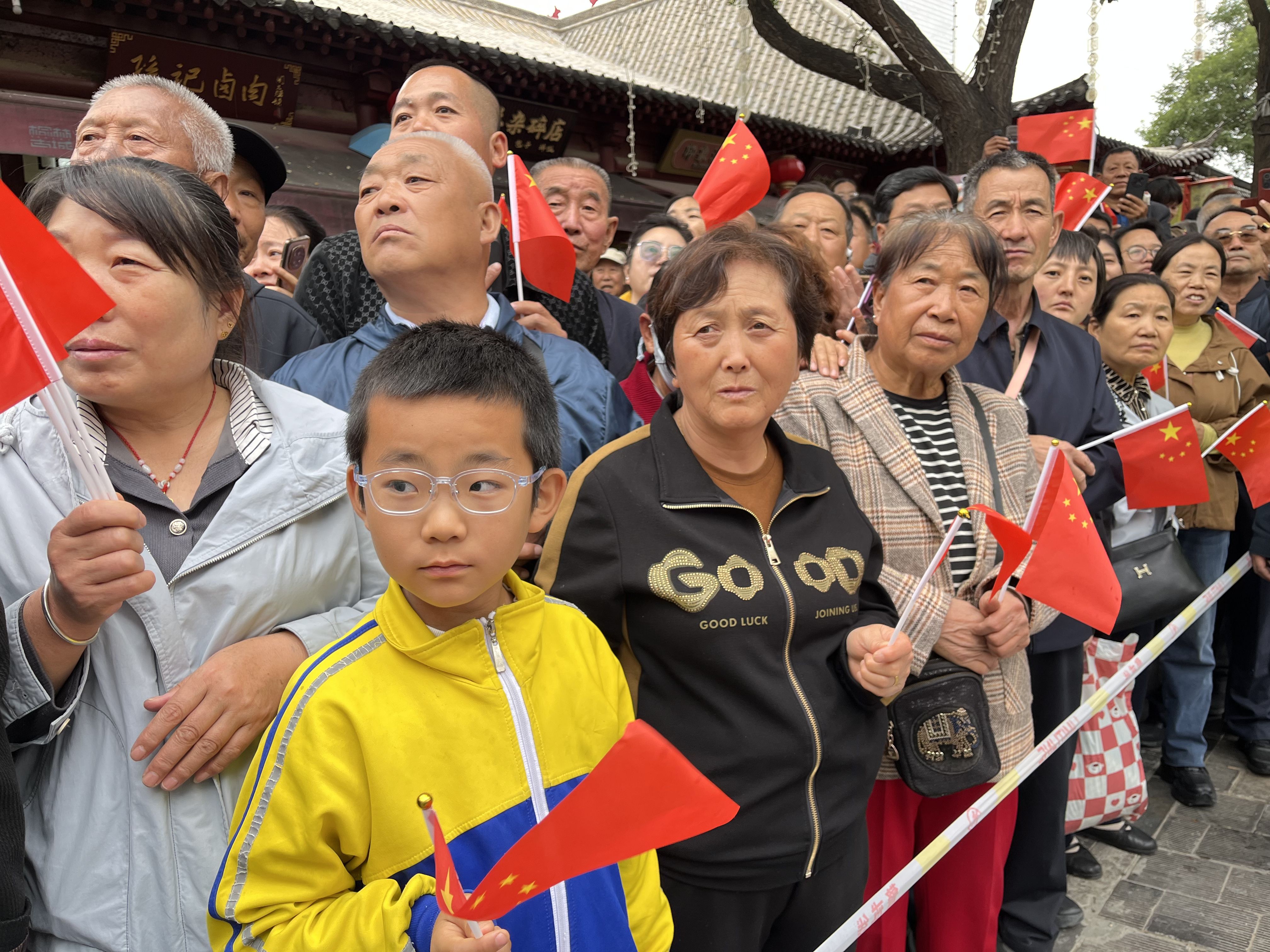 国庆期间,榆林古城迎来了大批游客。一位第三次来榆林的吉林长春游客杨景兰感叹道:“对榆林的印象非常深,这个古城文化底蕴非常深厚。国庆节来榆林,是因为这里特别喜庆。我观看了大街上的节目,非常精彩,一派祥和美好的景象。”当地市民们也纷纷走出家门,参与这场国庆狂欢。市民肖月飞带着孩子来到大街上看秧歌,感受国庆的氛围,并祝愿祖国越来越好,越来越繁荣。