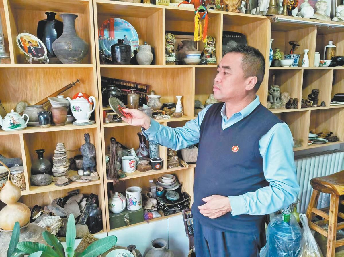 韩廷勇在整理自己收藏的展品。杨子江 摄