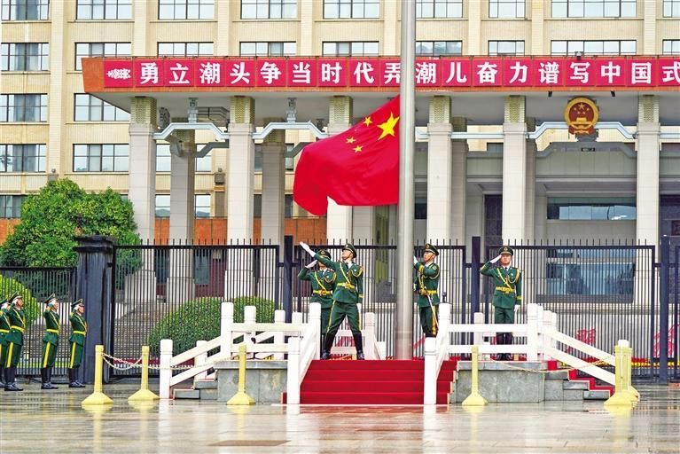 “向国旗——敬礼!”高亢激昂的口令划破长空,擎旗手奋力挥动右臂,将五星红旗抛向天空。伴随着雄壮的《义勇军进行曲》,鲜艳的五星红旗冉冉升起。