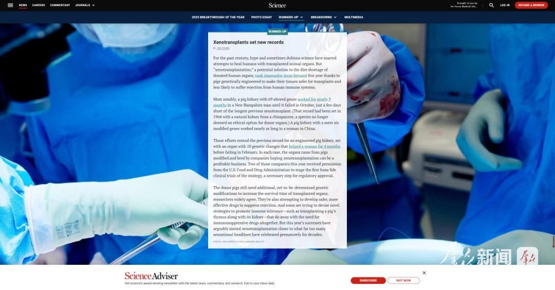 12月19日,记者从西京医院获悉:近日,美国《科学》杂志公布其评选的2025年度十大科学突破,该院窦科峰院士团队的异种器官移植入选。