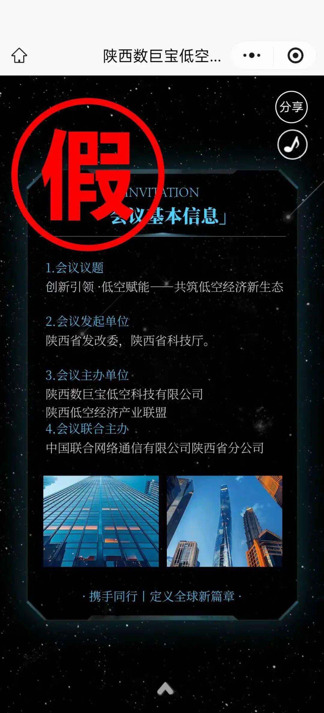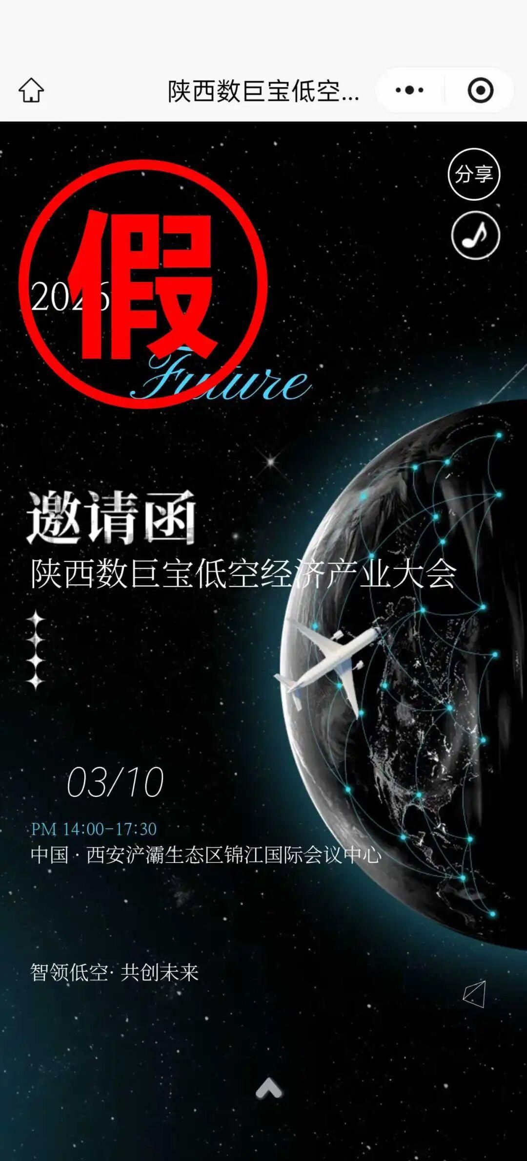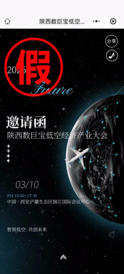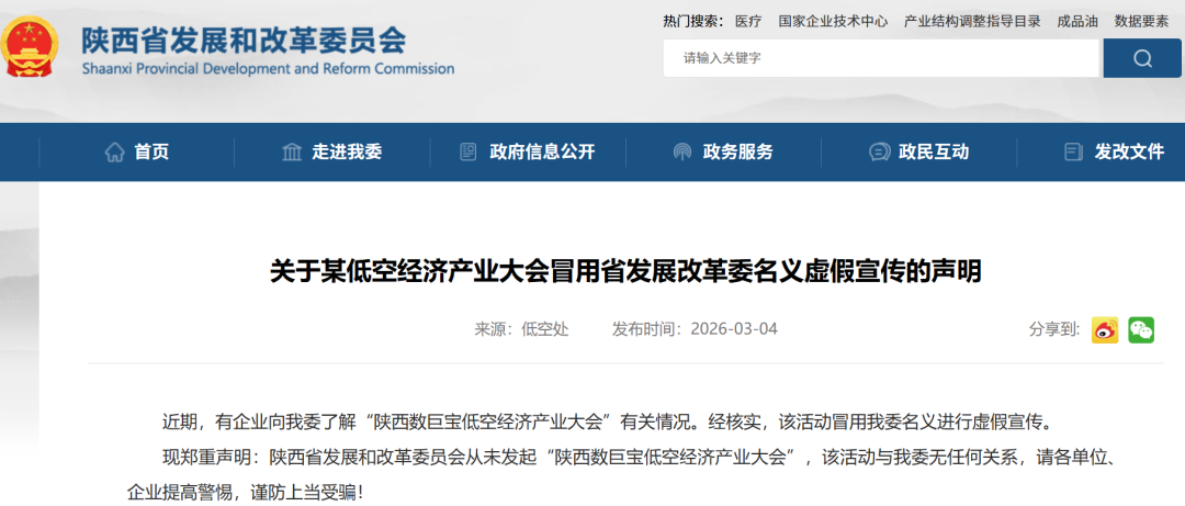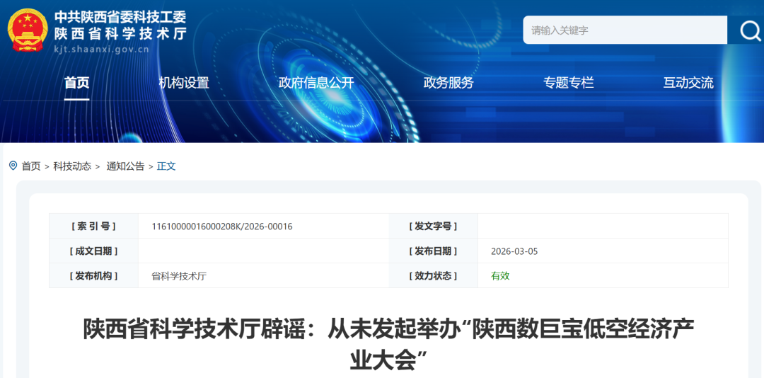 2026年3月5日,陕西省网络举报中心发布辟谣信息:经与陕西省科学技术厅核实,近日网络上流传的“陕西数巨宝低空经济产业大会”的信息,系冒用“陕西省科学技术厅”名义进行的虚假宣传,提醒各单位及广大企业提高警惕,切勿上当受骗。