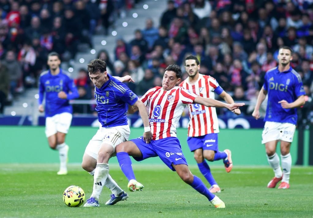 11月29日,马德里竞技队球员莫利纳(右三)与皇家奥维耶多队球员费德里科·维纳斯(左二)在比赛中拼抢。 当日,在2025-2026赛季西班牙足球甲级联赛第14轮比赛中,马德里竞技队主场2比0战胜皇家奥维耶多队。新华社发(古斯塔沃·巴连特摄)