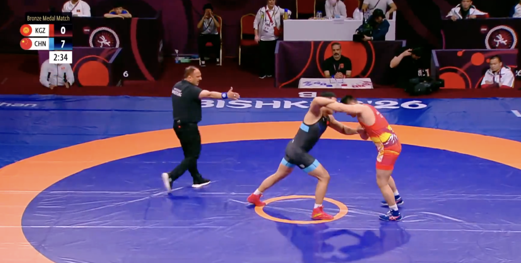 在奥运级别97公斤级铜牌赛中,王泽刚面对东道主选手梅利斯·艾特别科夫,全场打法积极主动。上半场他率先获得跪撑进攻机会,并连续完成三次抱腰滚桥,以7:0领先进入下半场。下半场对手发起跪撑进攻时,王泽刚顺势完成转移,并再次利用抱腰滚桥动作取得技术分,最终以11:1获胜。
