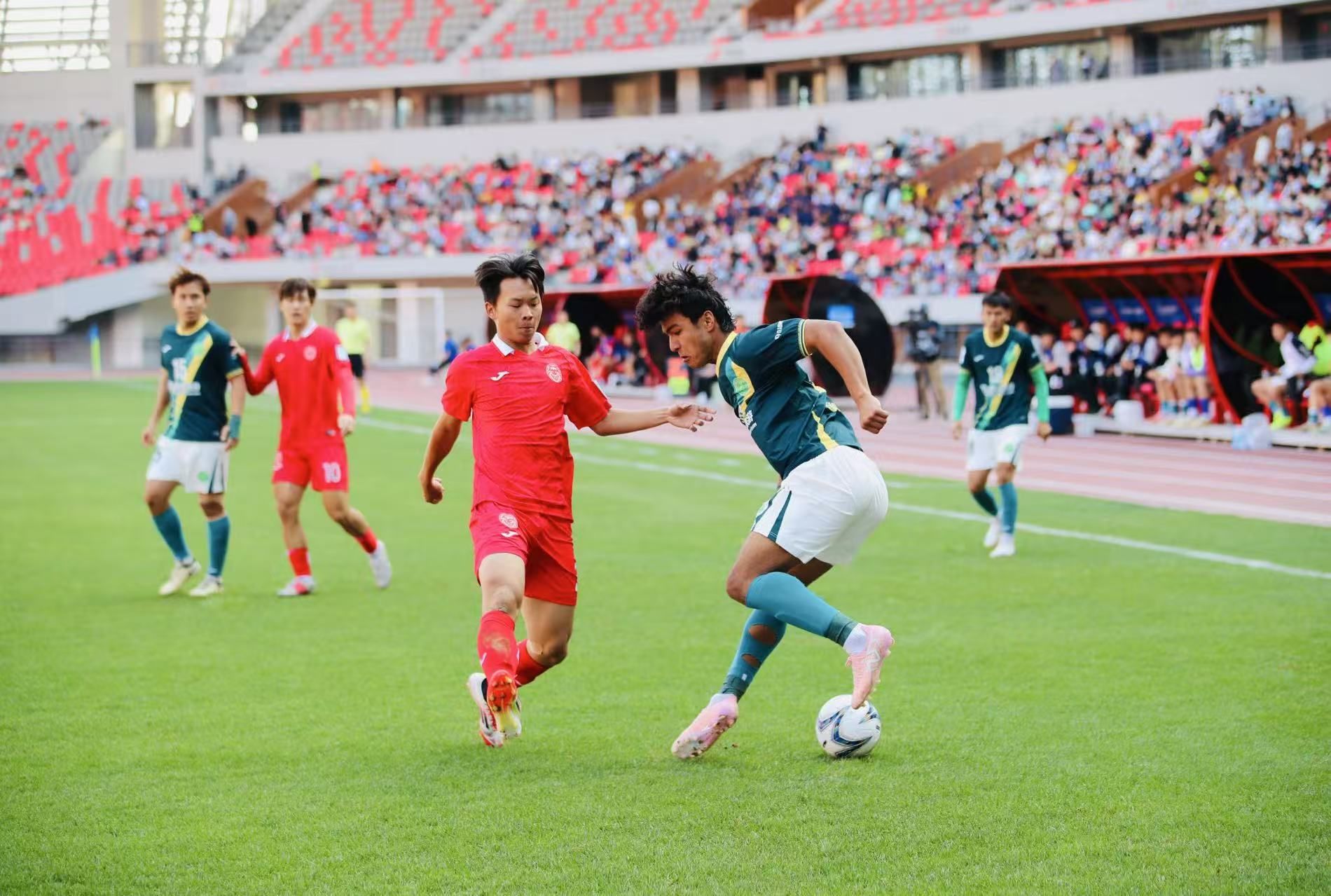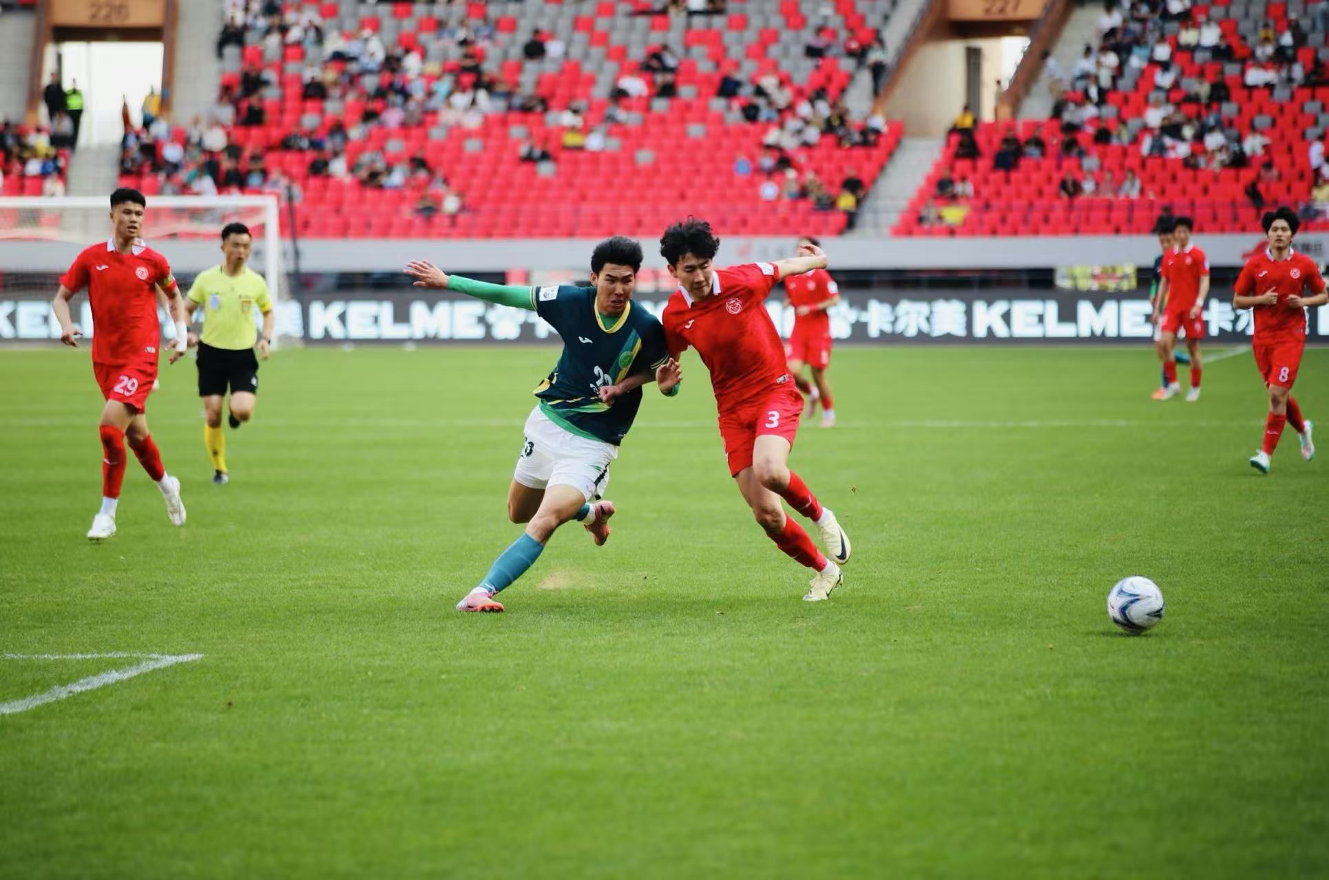 比赛开场后,榆林矿工旅投队迅速进入状态,在控球与进攻端持续压制对手,稳步掌控场上节奏。比赛第12分钟,榆林矿工旅投队率先打破僵局 ——60号钟纪宇迎球凌空斩,为球队取得1:0领先,瞬间点燃全场球迷热情。随后,赣州瑞狮队积极调整战术,寻找进攻突破口,双方在场上展开激烈角逐。