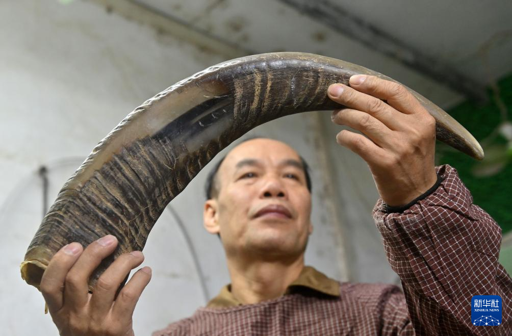 12月16日,宾阳武陵牛角制品制作技艺传承人叶华良在武陵镇叶角匠梳艺馆挑选准备加工的牛角。
