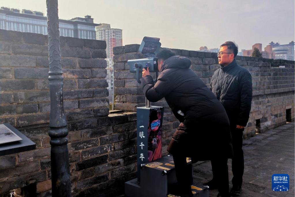 2026年1月5日,赵彬(右)在西安城墙上检查城墙的“一眼千年”AR望远镜设备。