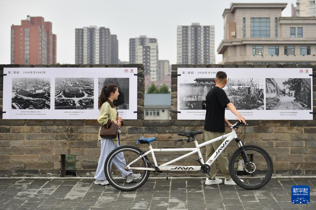 游客在西安城墙上参观以城墙保护为主题的图片展(2025年9月10日摄)。