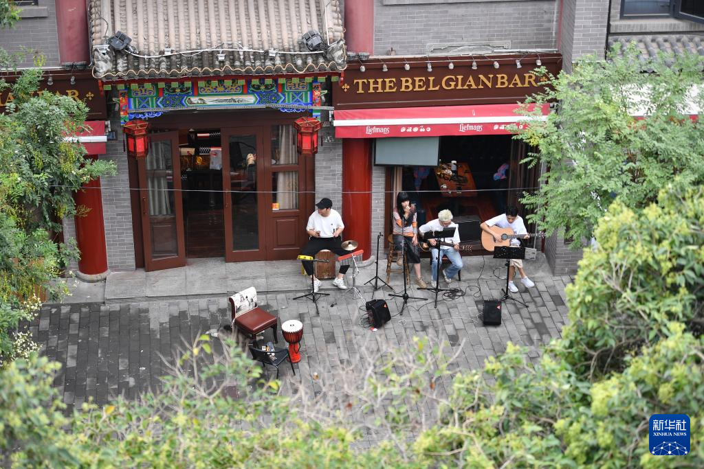 在西安城墙内侧顺城巷边的一家小店外,一支乐队在排练(2025年9月10日摄)。