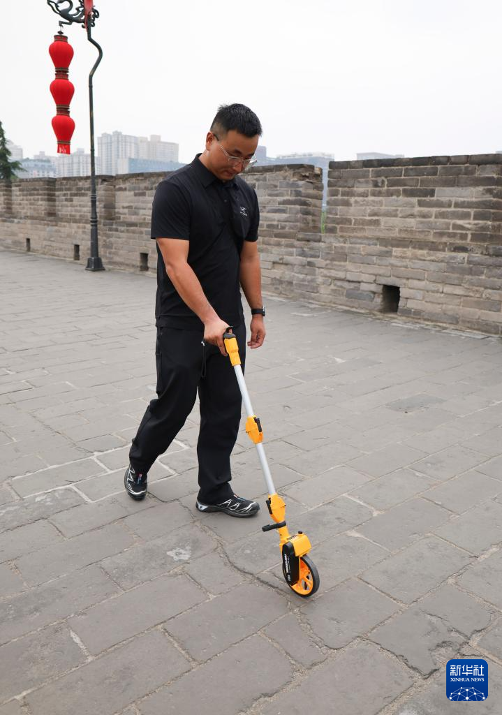文保巡查员在西安城墙上测量海墁裂缝长度(2025年9月10日摄)。