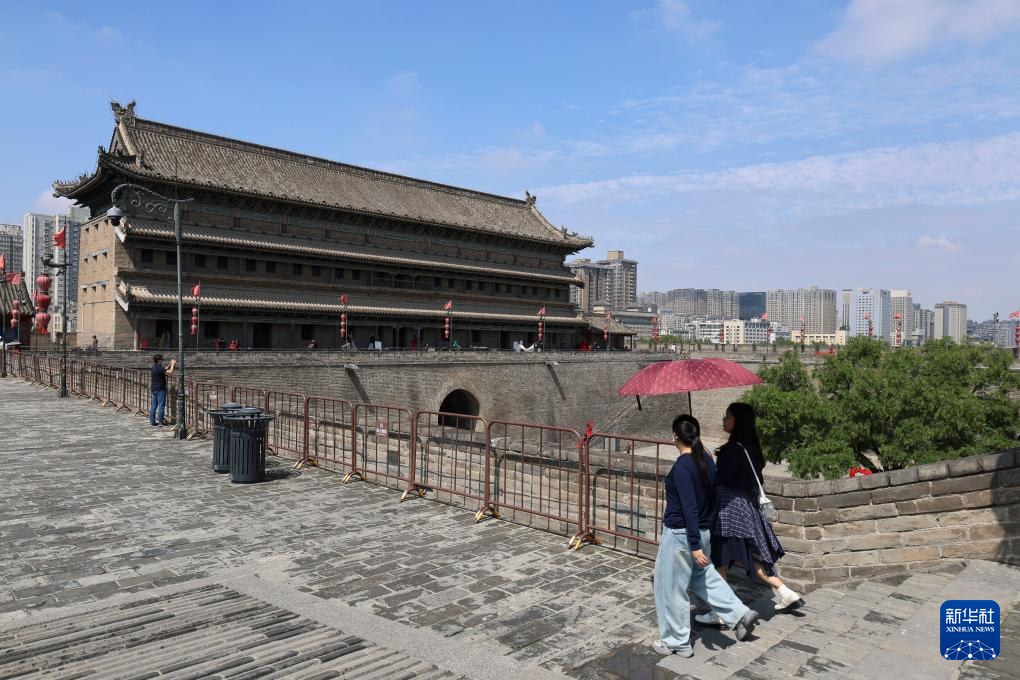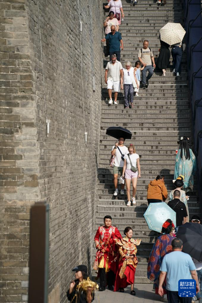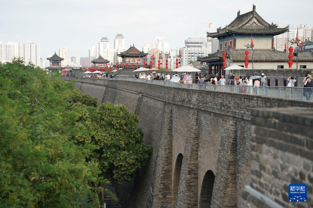 游客在西安城墙上游览(2025年9月12日摄)。