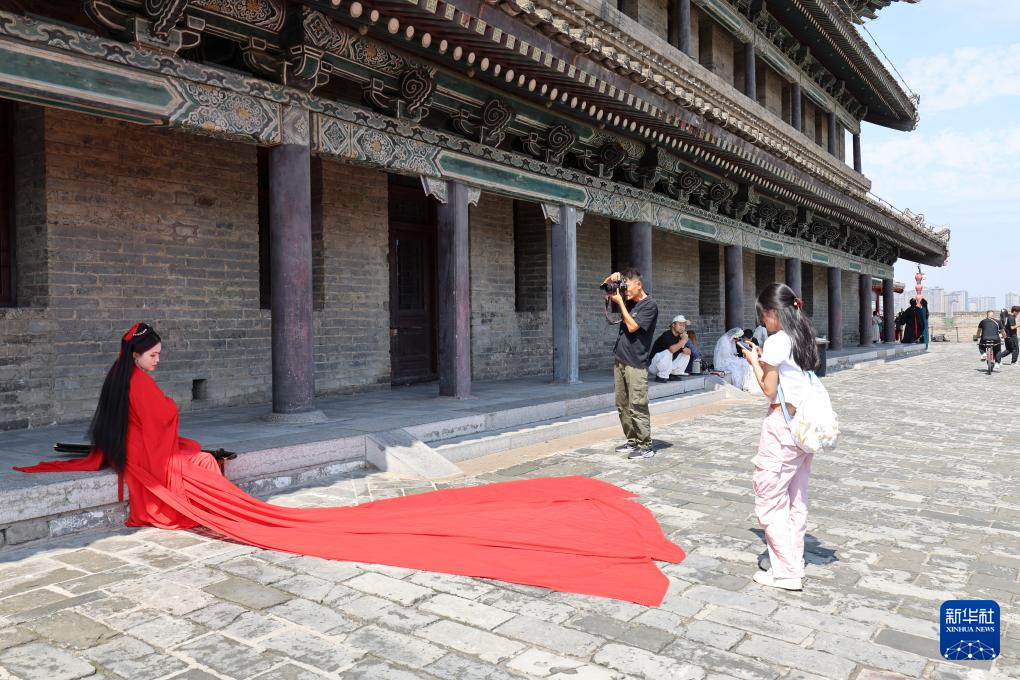 游客在西安城墙上拍摄艺术照(2025年9月12日摄)。