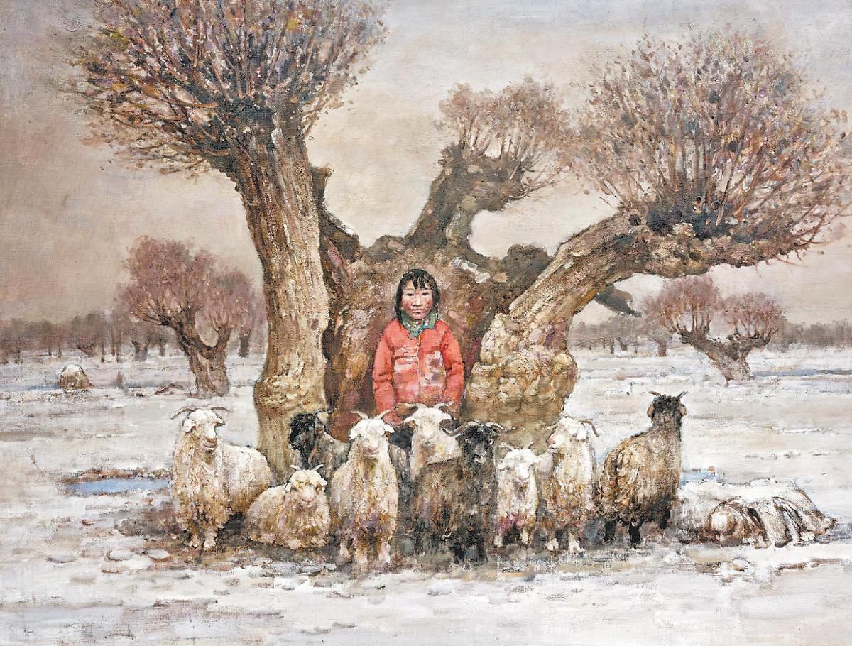 塞北系列则将人瞬间拽回苍茫辽阔的高原。大柳树下,牧羊孩童甩动响鞭,碎花衫姑娘倚树远望,白发老农拄着铁铲默然伫立;长城脚下,残垣断壁间,羊群漫过茵茵草甸,牧羊人的歌声仿佛穿透画纸,在耳畔悠悠回荡。这是独属于塞北的人间烟火,是我们儿时最寻常、也最眷恋的光景。