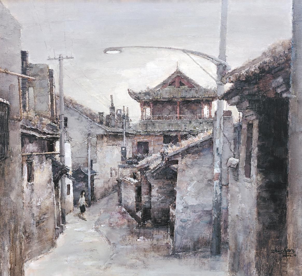志春先生的油画从不拘泥于外在环境下实时实地的视觉局限,但同时又恪守写生的视觉规律。他如刀锋的笔触是发自内心、源于对自然的崇拜与诗意的直觉表达。他从不刻意追求精准再现,而更看重主观取舍。他画中的色彩和线条,完全成为了情绪的载体。可以说,作品的五个系列是画家用心灵与古城、面孔、静物等在对话,他画中的一砖一石均因其对故乡的深深眷恋,有了人文温度,其对生命本质的深刻叩问,以及那种将人当大地,将大地当人的观看与表达,正像画家本人所说:“留下的不仅是废墟与创新,还蕴含着精神重获新生的各种可能。”