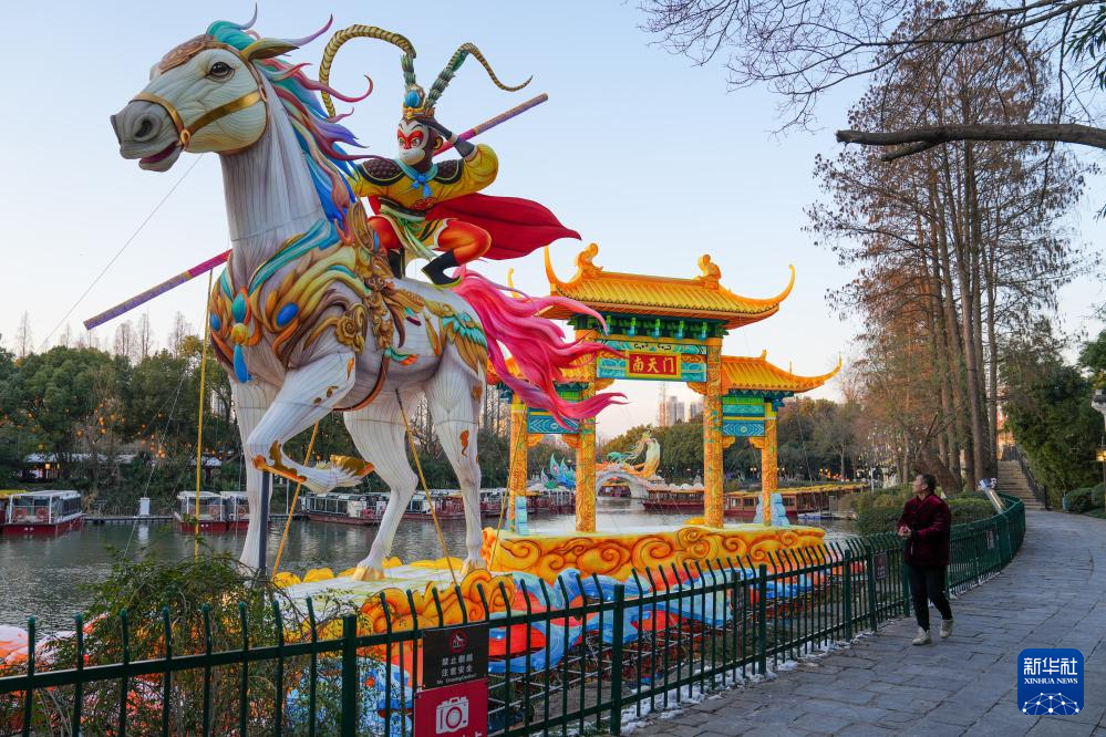 陆敏在白鹭洲公园内观看第40届秦淮灯会灯组造型(1月21日摄)。