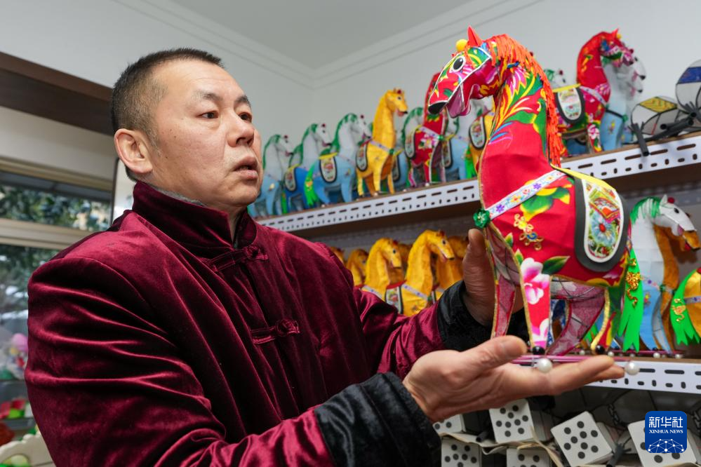 陆敏在工作室内展示马年生肖灯(1月21日摄)。