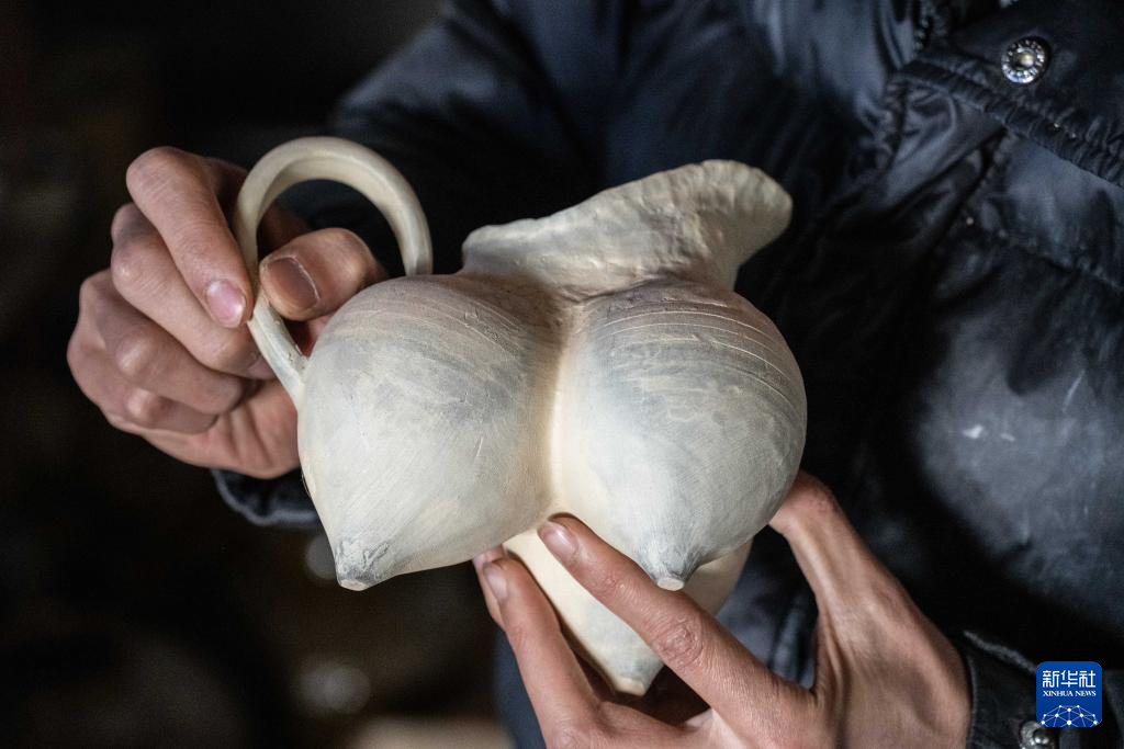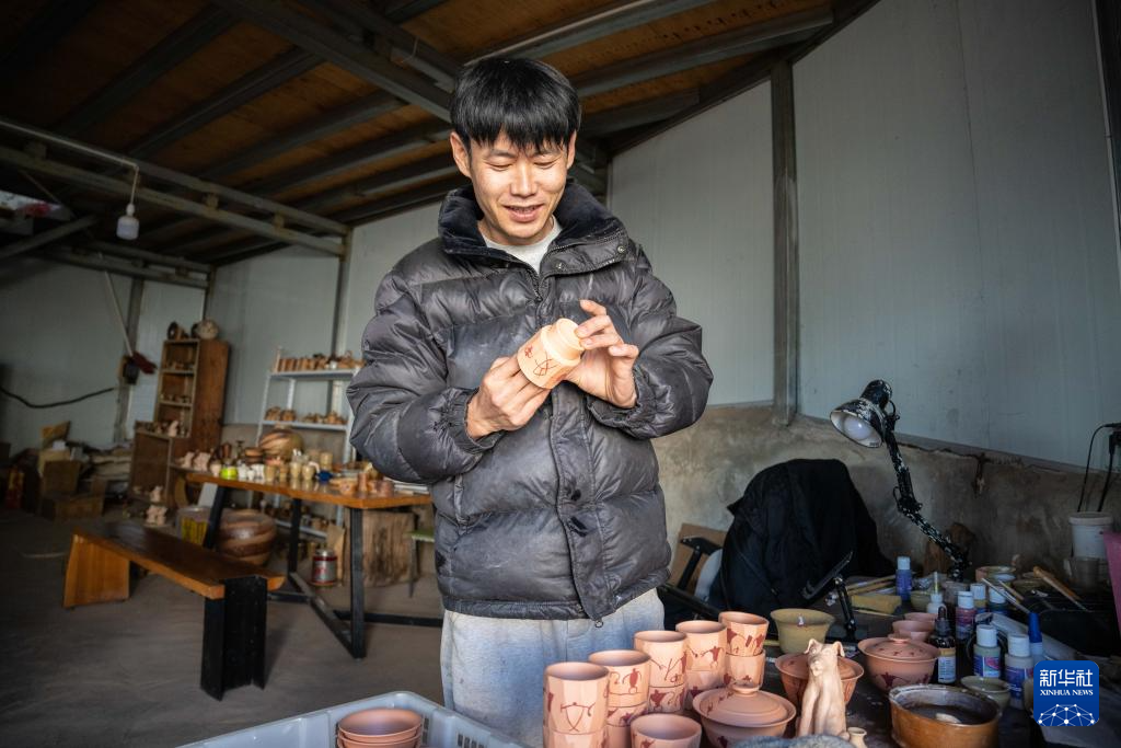 1月22日,村民在云南省临沧市碗窑村展示其制作的带有沧源崖画元素的陶器。