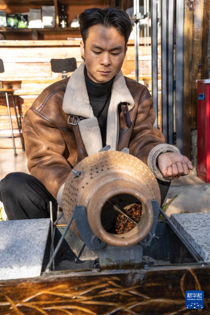 1月22日,咖啡师在云南省临沧市碗窑村一家咖啡店利用陶罐烘焙咖啡,制作“土陶咖啡”。