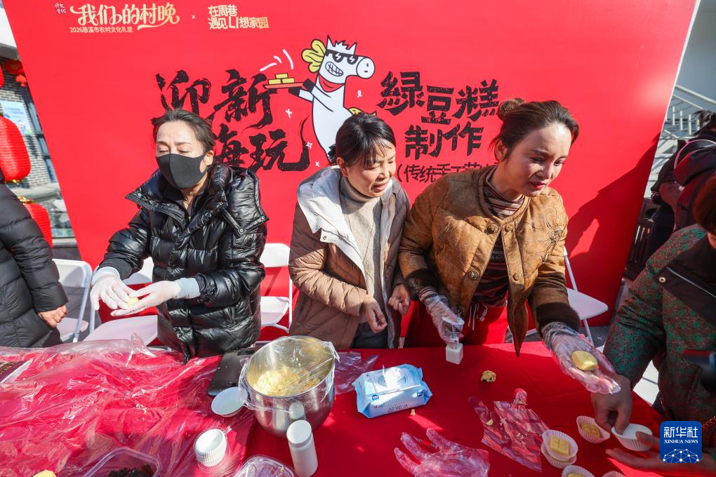 1月22日,当地百姓在周巷镇万安庄村文化礼堂“我们的村晚”活动现场体验制作绿豆糕。