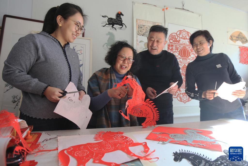 1月22日,在山东省荣成市石岛管理区港湾街道文化活动室,剪纸艺人刘秋白(左二)向剪纸爱好者讲解马的剪纸技巧。