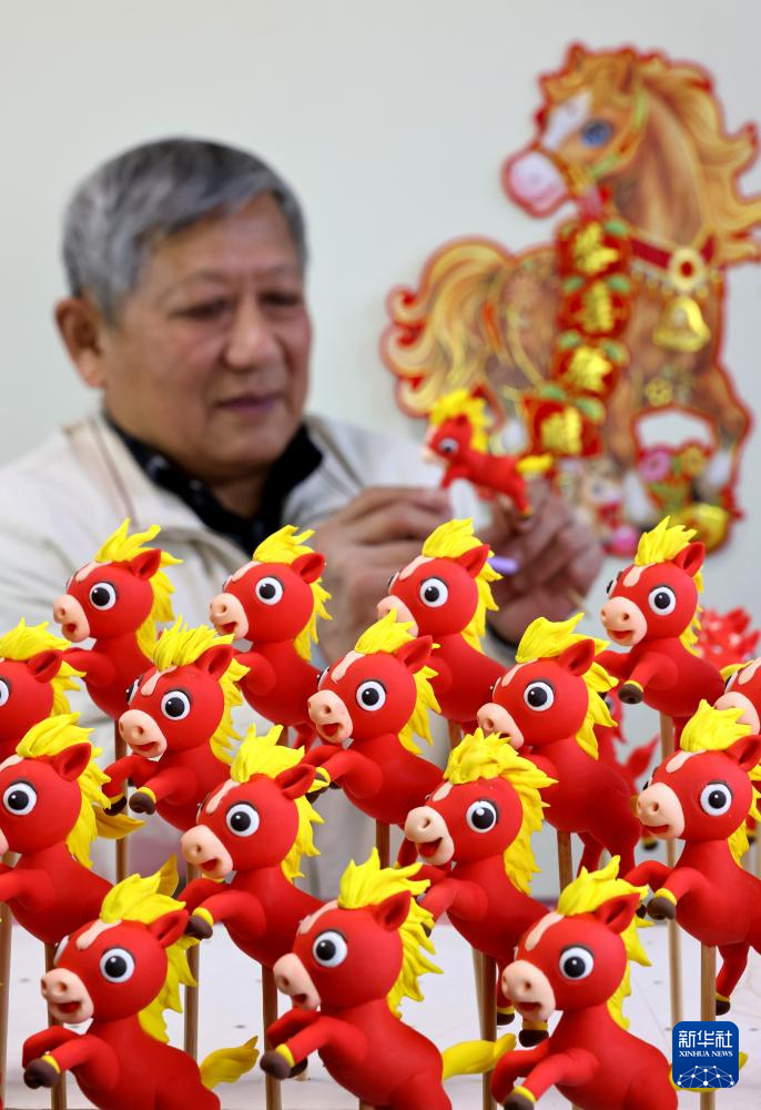 1月16日,在山东省临沂市沂南县红石寨非物质文化遗产博物馆,面塑艺人左安胜在创作面塑作品“赤马踏春”。
