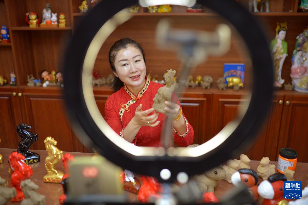 1月21日,在山东省青岛市城阳区河套街道汇海社区泥塑非遗工坊,刘梅铃通过网络直播销售。