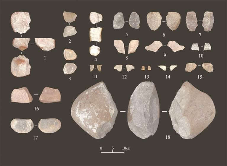 根据《简报》,石制品原料以石英岩为主,燧石、石英和石英砂岩次之。类型包括石锤、石核、石片、工具、断块和碎屑。工具以刮削器为主(11件),存在少量手镐(2件)、两面器(1件)和石锥(1件),主体属于简单石核—石片技术的产品。