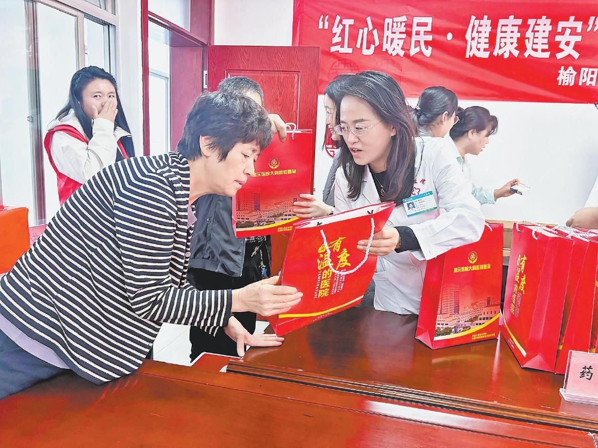 9月25日,榆阳区青山路街道建安路社区联合星元医院举办了以“红心暖民 健康建安”为主题的女性健康讲座暨义诊活动,这是医护人员为前来听讲座的女性送上“健康礼包”。