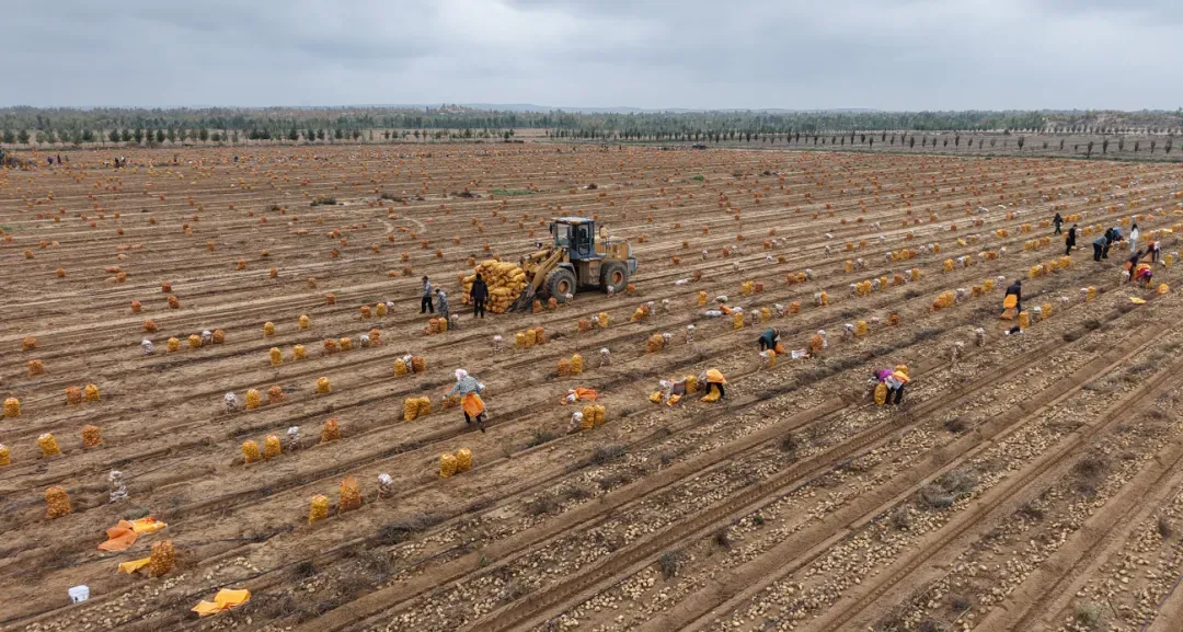 同样,在榆阳区红石桥乡韩家峁村马铃薯种植基地,两台马铃薯收获机并行作业,数十名工人将马铃薯分拣装进袋子,并运到货车上。“我们这里有3700多亩土地,全都种的是马铃薯,产品一部分卖到国内各个农贸市场,一部分送到本地淀粉加工厂进行加工。”榆林漠泉沃薯农业科技有限公司总经理高翔介绍。该公司正在建设马铃薯米加工生产线,预计产能3000吨,投产后将进一步实现马铃薯深加工,大力推进马铃薯全产业链发展。