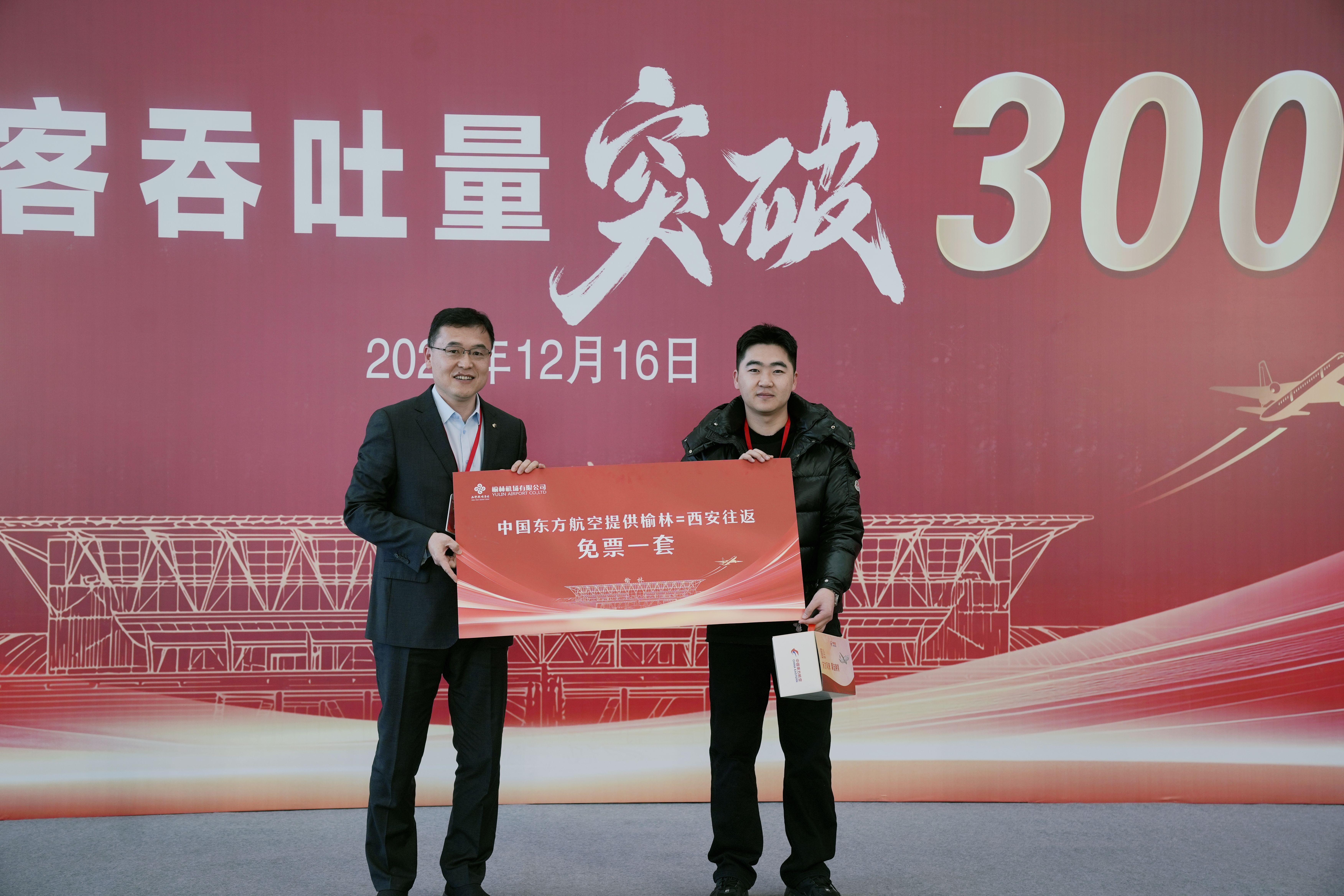 当天上午,榆林机场在T2航站楼举行了见证活动,相关单位工作人员与旅客共同分享了这一里程碑式的喜悦。今年第300万名旅客张行被邀请上台,获赠精美飞机模型及西安—榆林往返免费机票。“非常荣幸能成为第300万名旅客”,张行在采访中激动地表示,“我经常从这里搭乘航班出行,一直感觉榆林机场现代化的管理理念和人性化的真情服务,让我们的出行越来越便捷。祝愿榆林机场越来越好,架起更多联通八方的空中桥梁!”