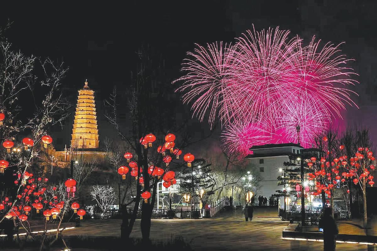 图为2月16日,烟花在榆林城东上空绽放。 记者 杨彬 摄