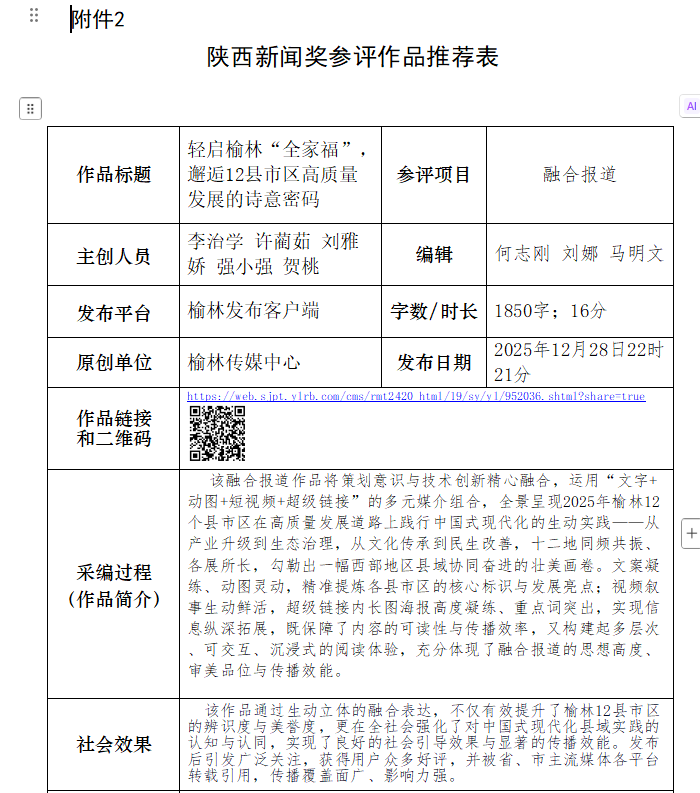 榆林传媒中心关于报送2025年度陕西新闻奖融合报道、应用创新、新媒体新闻专栏参评作品的公示
