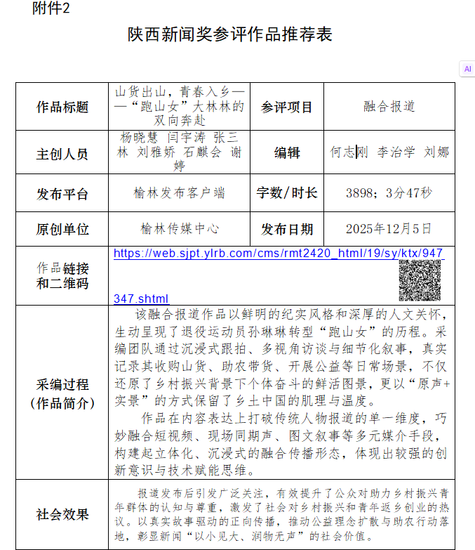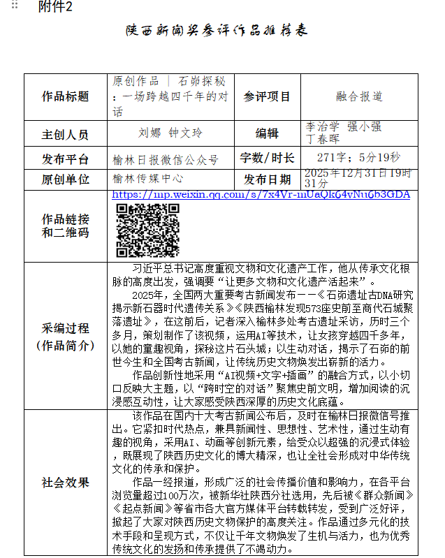 根据陕西省记协新媒体专业委员会《关于开展2025年度陕西新闻奖融合报道、应用创新和新媒体新闻专栏作品推优工作的通知》要求,经我中心采编人员民主推荐,编委会成员评审,研究决定:报送《原创作品| 石峁探秘:一场跨越四千年的对话》《轻启榆林“全家福”,邂逅12县市区高质量发展的诗意密码》《山货出山,青春入乡——“跑山女”大林林的双向奔赴》3件作品参加陕西新闻奖评选。