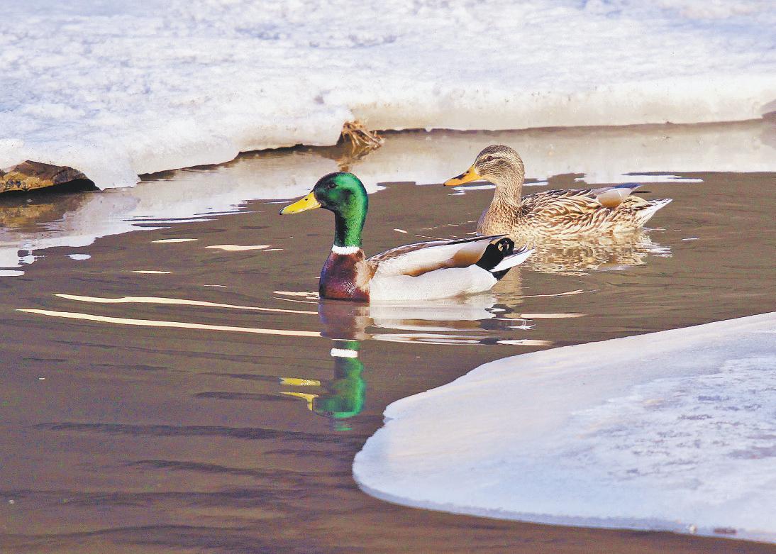 绿头鸭外形大小如家鸭。雄鸟嘴黄绿色,脚橙黄色,头和颈辉绿色,颈部有一明显白色领环;雌鸟羽色斑驳,整体灰褐色,低调却不失活力。它们栖息于淡水湖畔,亦成群活动于江河、湖泊、水库等水域,在榆林全境分布,以植物为主食,也吃无脊椎动物和甲壳动物,是市民最易见到的野生鸭类之一。
