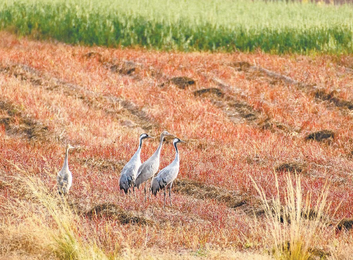 灰鹤是大型涉禽中的“灰色绅士”,全身羽毛呈灰色,头顶裸皮红色,像戴了一顶“小红帽”。它们栖息于开阔平原、草地、沼泽、河滩及农田地带,在榆林定边、榆阳等地常见,冬季集群活动,觅食植物种子和农作物,与人类活动区域和谐共处。
