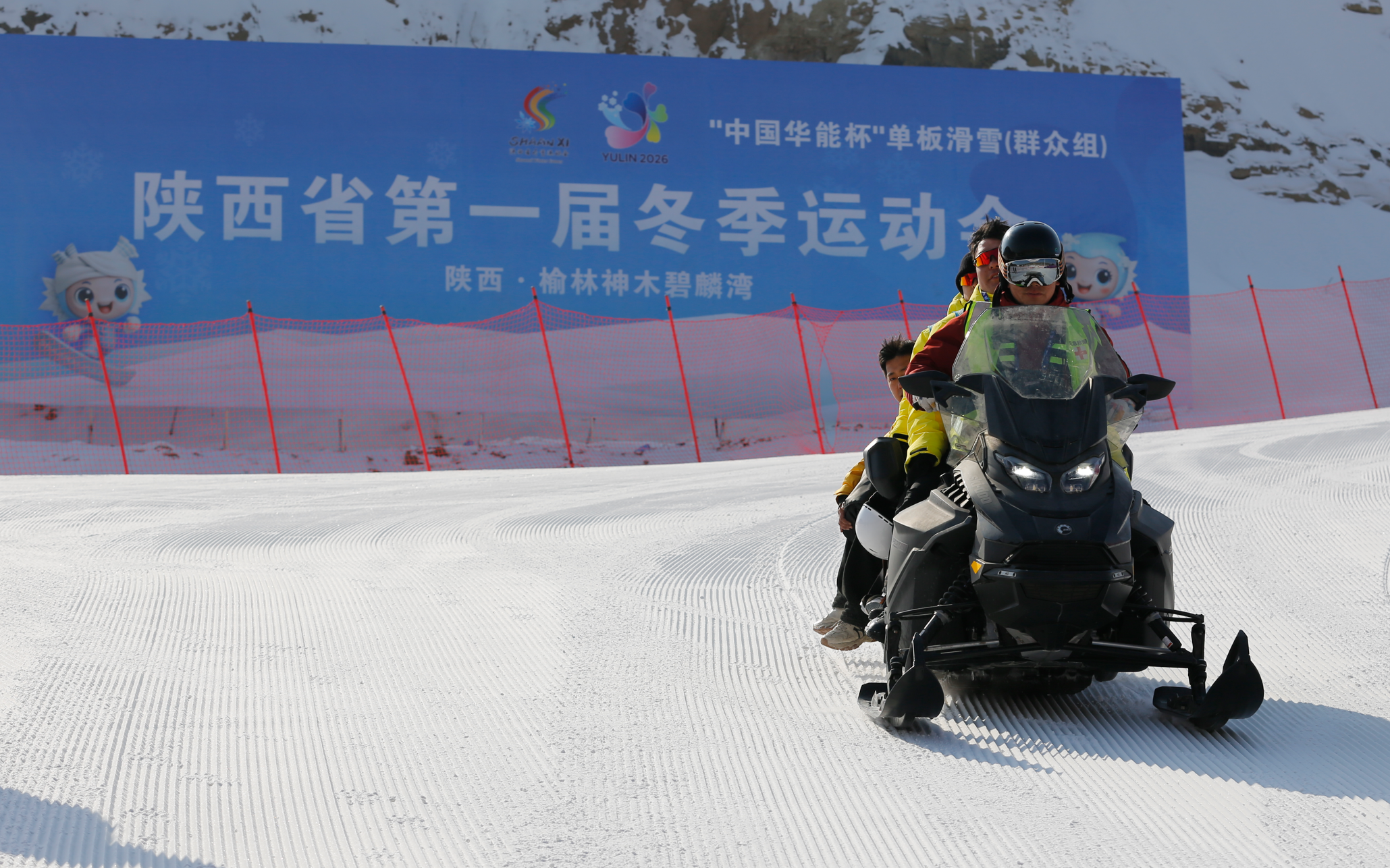 1月30日,在省一冬会“中国华能杯”单板滑雪(群众组)的赛场上,一辆雪地摩托正稳健划过雪面,载着工作人员穿梭于白雪与速度之间。