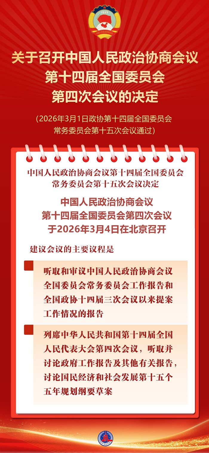 中国人民政治协商会议第十四届全国委员会常务委员会第十五次会议决定:中国人民政治协商会议第十四届全国委员会第四次会议于2026年3月4日在北京召开。建议会议的主要议程是:听取和审议中国人民政治协商会议全国委员会常务委员会工作报告和全国政协十四届三次会议以来提案工作情况的报告;列席中华人民共和国第十四届全国人民代表大会第四次会议,听取并讨论政府工作报告及其他有关报告,讨论国民经济和社会发展第十五个五年规划纲要草案。